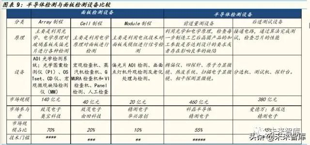 (4)技术难度差异较大:面板的 Array 和 Cell 环节与半导体前道量测 设备检测原理相似,均采用光学和电学原理进行物理性的检测。但是 同样为光学检测,半导体检测的精密程度(半导体检测至少到纳米 级,面板检测最高到微米级)、检测维度(比如膜厚检测设备要求对 图像三维立体有三维立体效果,而面板检测要求二维平面图像即可) 等许多指标要求更高,技术难度更大。