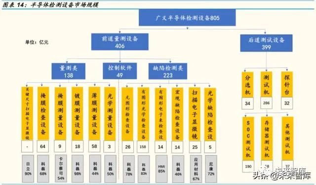 根据 SEMI 统计及我们的测算口径,全球半导体检测类设备市场规模超 800 亿,其中前道量测设备市场规模 406 亿元左右,后道测试设备 399 亿 元左右。