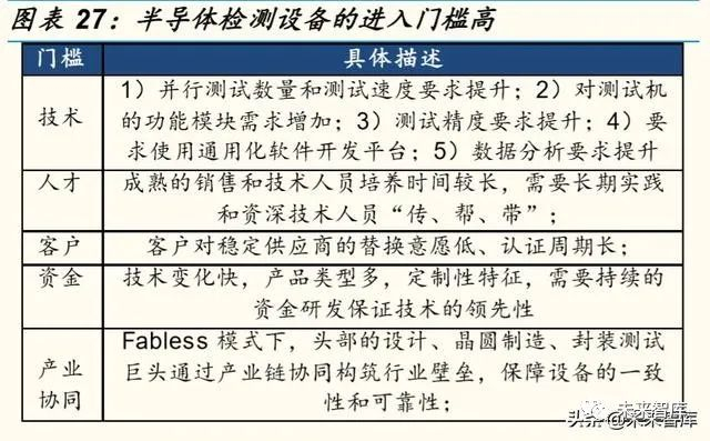 半导体检测设备的进入门槛较高,强者越强属性突出。半导体检测设备的 门槛体现在技术门槛、人才壁垒、客户资源壁垒、资金壁垒和产业协同壁 垒。