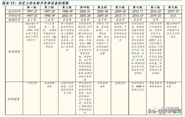 1991~2019 年,全球半导体设备先后经历了 9 轮小周期,每一轮周期基本 与全球经济的库存周期保持同步,持续时间在 3.5 年左右。对每一轮周期 的复盘见下图。