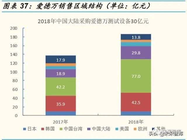 (2) 区域结构:按区域划分,爱德万最大的收入来源为中国台湾地区,主 要为台积电的采购,2018 年规模为 77 亿元,占爱德万总收入比重 41%,中国大陆 2018 年采购规模为 30 亿元,占爱德万收入比重 16%。