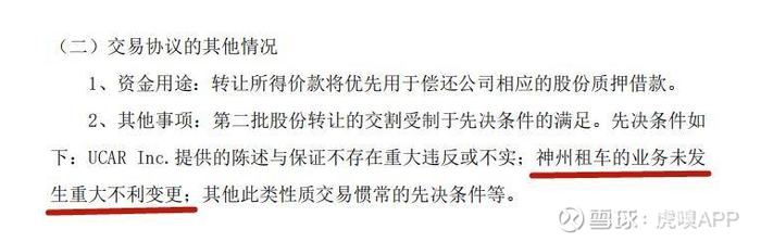 在神州优车4月21日的资产出售公告中,可以找到这笔股份的转让先决条件:“UCAR Inc.提供的陈述与保证不存在重大违反或不实;神州租车的业务未发生重大不利变更;其他此类性质交易惯常的先决条件等。”