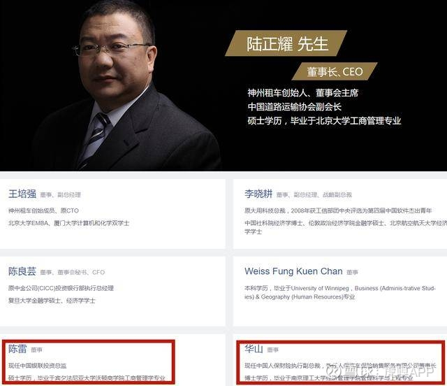 公开资料显示,神州优车董事会包括CEO陆正耀、副总经理王培强、副总经理李晓耕、CFO陈良耘等4位核心高管,以及外资股东Orchids Capital代表陈凤娟(Weiss Fung Kuen Chan)、中国银联投资总监陈雷和人保财险执行副总裁华山等7人。