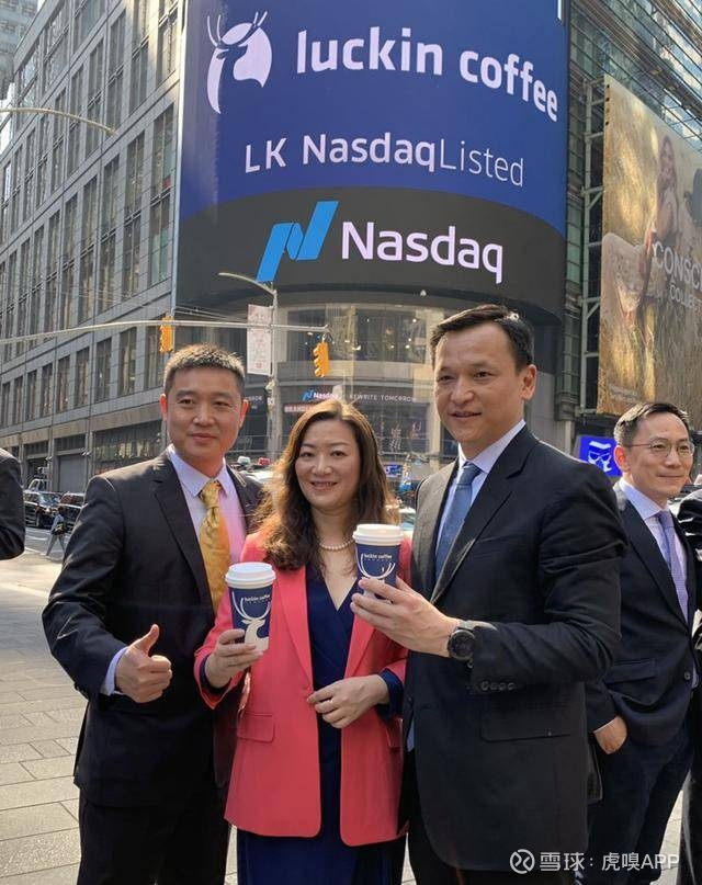 瑞幸上市当天,黎辉(右)与瑞幸创始人钱治亚合影