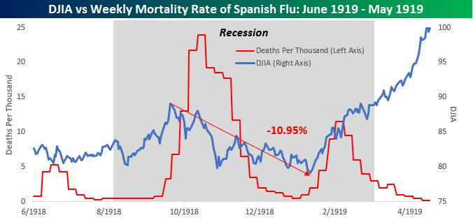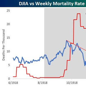 “很明显,将两个相隔100多年的疫情时期进行对比,远不像拿一个苹果与另一个苹果来比较那么容易,”贝斯普克说,“不过,有趣的是,1918年那场更致命的大流感期间,道指甚至从未接近过熊市。”