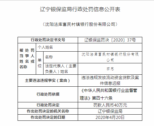 沈阳法库富民村镇银行被罚40万:违法发放流动资金贷款
