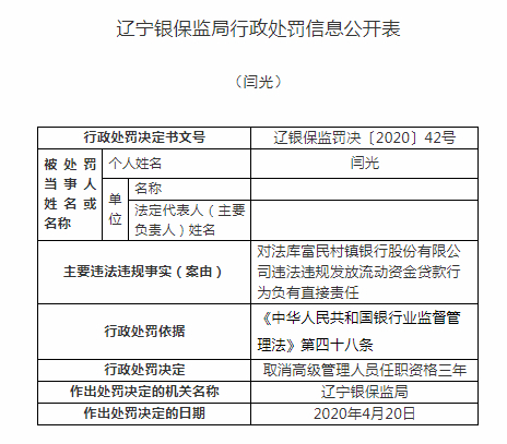 辽宁银保监局决定对沈阳法库富民村镇银行股份有限公司罚款人民币40万元。同时,对张延风取消高级管理人员任职资格三年,对赵凯警告,对闫光取消高级管理人员任职资格三年。