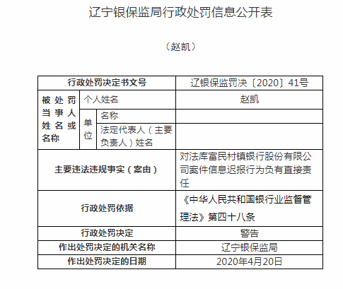4月23日消息,辽宁银保监局公布行政处罚信息公开表显示,沈阳法库富民村镇银行股份有限公司存在违法违规发放流动资金贷款及案件信息迟报的行为。张延风对法库富民村镇银行股份有限公司违法违规发放流动资金贷款行为负有直接责任;赵凯对法库富民村镇银行股份有限公司案件信息迟报行为负有直接责任;闫光对法库富民村镇银行股份有限公司违法违规发放流动资金贷款行为负有直接责任。