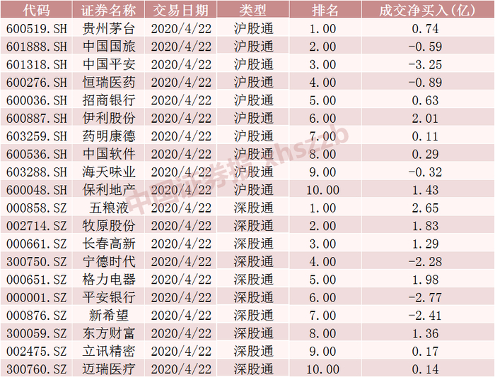沪股通、深股通4月22日十大活跃股情况
