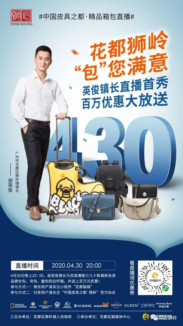 新华财经北京4月23日电 4月30日晚上8点,中国皮具之都英俊镇长为您带货!广州市花都区狮岭镇镇长谢英俊将进行直播首秀,为多款精品箱包带货。推荐什么大家都买走, 买它买它就买它。还有免单、秒杀、满减优惠神券等你来。