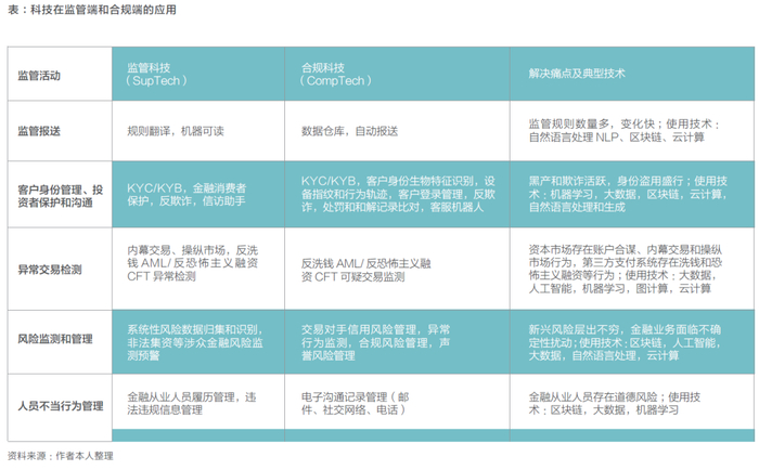 从该表应用场景看,监管端在理想状态下有望实现监管报送、身份管理、异常检测等监管活动的模型化、智能化、自动化、实时化,其主要功能在于对各种风险进行精准实时监测。为明确表达其实质,同时避免RegTech和SupTech之间汉语表达的混淆,本文将监管端使用的监管科技具体化为监测科技(Monitoring Technology,MoniTech)。从合规端来看,技术使得数据报送、合规管理、客户核验和服务环境登录等功能更加高效便捷,同时更加精准透明实时地刻画先前未被刻画的风险类型,称为合规科技CompTech是恰当的。