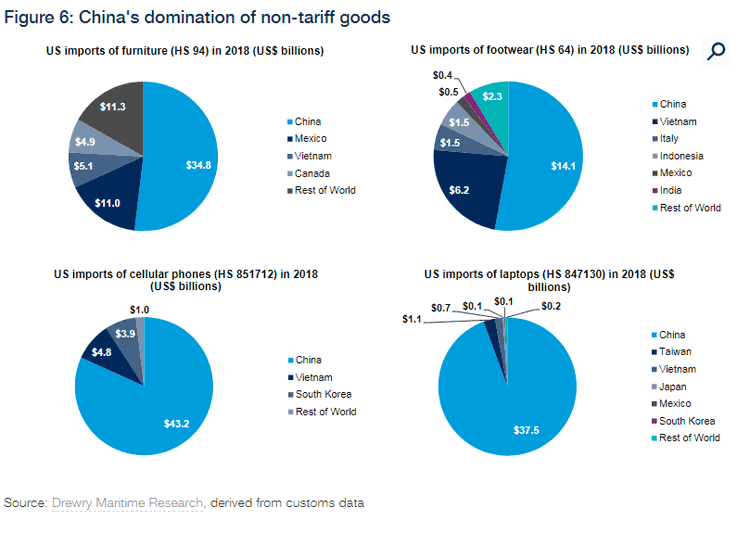 2018年美国入口的家具和鞋类产品当中,只有约一半来自中国;但手机和笔记本电里,超过70%均产自中国。