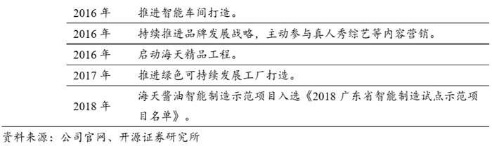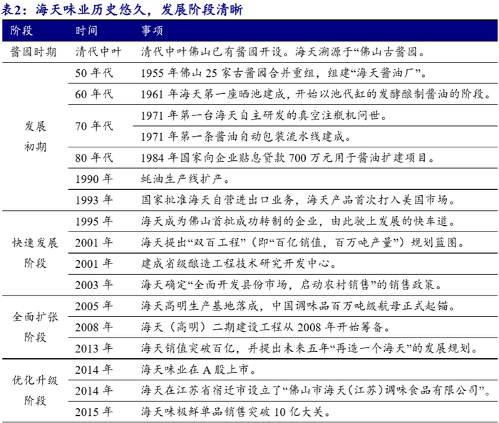 第三阶段:1995年-2004年,公司处于快速发展阶段。1995年海天成为佛山首批成功转制的企业(国资持股30%,企业职工持股70%)。2000年国有股权转让,公司变革为中外合资公司。此阶段公司采取市场化营销手段,加快发展步伐,在当时酱油还处于分散格局时迅速做大规模,成为酱油行业龙头,同时开启多品类发展。