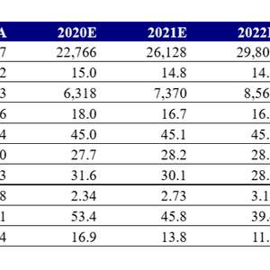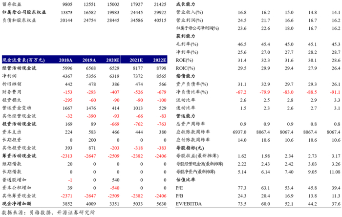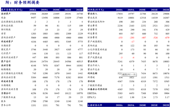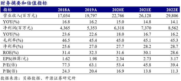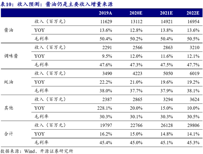 我们认为海天味业2020年营业收入将有15%左右增长。分产品看,酱油应可保持13%左右增速,蚝油还可以保持21%左右的高增长。调味酱大概率回归至12%左右的双位数增长水平。2020年的疫情对调味品行业带来短期冲击,公司凭借强大品牌力与渠道推力,应可弥补疫情期间损失,完成年初即定目标。我们预计2020-2022年公司营收分别增长15.0%、14.8%、14.1%。