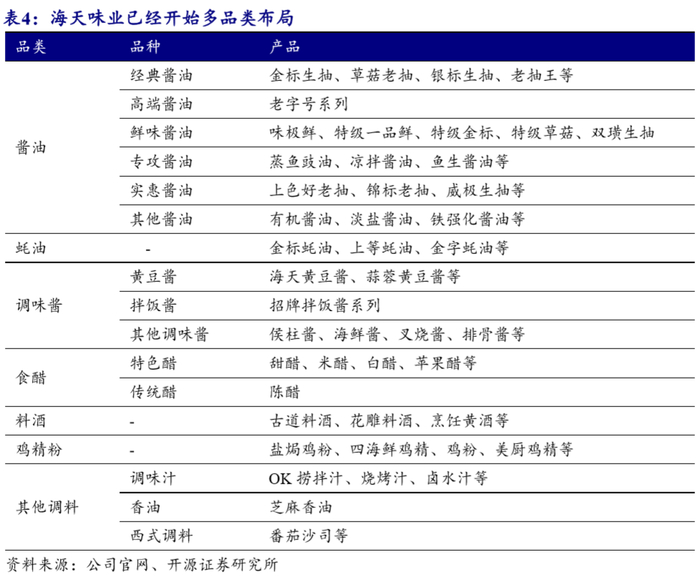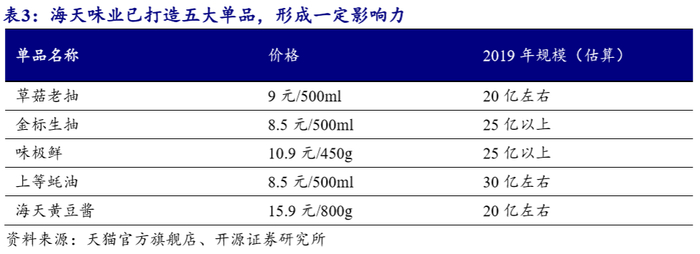 依靠大单品突破,打开渠道通路。公司早期生产的草菇老抽,产品质量过硬,具有酱香浓郁、上色持久不变的特点,明显优于同期竞品,非常适合餐饮店使用。海天味业凭借草菇老抽,迅速在餐饮渠道打开市场,占据先发优势,大单品作用得以体现。2000年前后现代商超大卖场迅速崛起,海天味业依靠核心产品金标生抽迅速取得突破。消费升级风口来临之时,公司又推出味极鲜单品,卡位升级主流价格带,2015年规模突破十亿。现在公司已形成5个大单品:草菇老抽、金标生抽、味极鲜、上等蚝油以及海天黄豆酱。