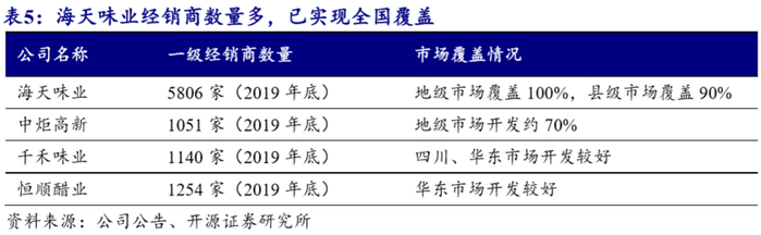 海天味业率先实现全国化,销售渠道广度行业第一。庞大的经销商与终端网点数量能够保证公司覆盖大部分餐饮、商超、流通等渠道。2019年底海天味业一级经销商数量5806家,实现31省会和直辖市100%覆盖,地级市100%覆盖,县级市场90%覆盖。横向比较,海天味业市占率远高于调味品排名第二的雀巢和李锦记,实现真正的全国化布局。