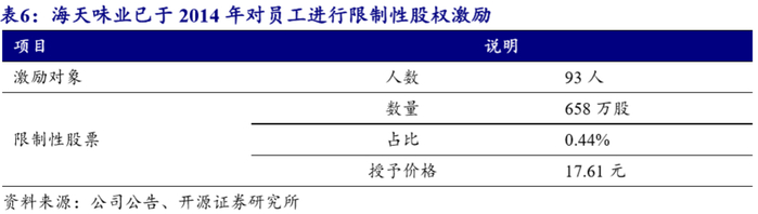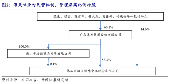管理层高比例持股。截至2019年末,海天集团直接持股比例为58.26%,并通过佛山海鹏间接持股0.12%,合计持股58.38%,为公司第一大股东。庞康、程雪、陈军阳、黄文彪、吴振兴、叶燕桥等为一致行动人和公司实际控制人,直接及通过海天集团间接持有海天味业合计49.65%的股权。此外公司多数管理层均有持股,与公司利益高度绑定,有利于推动政策发展,保持公司活力。