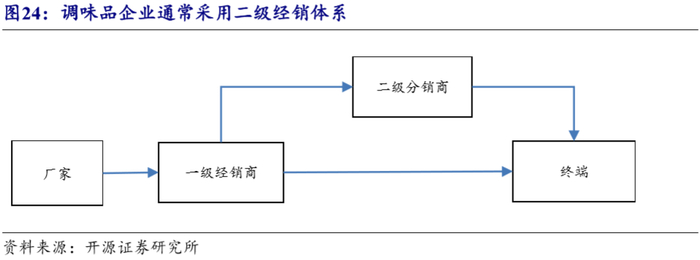 渠道模式:二级经销管理,利益绑定较深。包括海天味业、厨邦美味鲜在内的调味品企业多采取一级经销商与二级分销商的渠道体系,公司直接向一级经销商发货,一级经销商或直接面向终端,或对接分销商向终端出货。公司直接管控一批商,可实时监测一批商库存,年底完成任务给予返利。一批商对接分销商,二者会在公司主导下签订联盟协议,共享部分利益,公司派人协助分销商共同开发市场、维护市场,进行深度分销。人员费用由厂家与经销商共同承担。该种模式优点在于,一是增强分销商粘性;二是提升厂家对渠道管控程度,即使经销商流失,厂家也不会丢失市场。