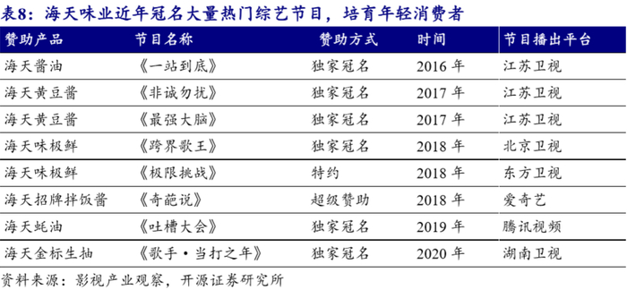 始于2016年的品牌提升战略,是海天品牌形象突破的重要手段。通常调味品企业主要冠名厨房类节目。海天味业在2016年开始大量投放广告,冠名综艺节目进行品牌塑造。综艺节目在年轻消费群体中广泛传播,海天味业将主推产品与年轻群体喜爱的综艺节目相结合,对年轻群体进行品牌教育,谋求长远布局。2016年至今海天味业冠名多个热门综艺节目,在年轻群体中已树立良好的品牌观念。
