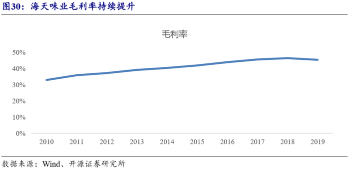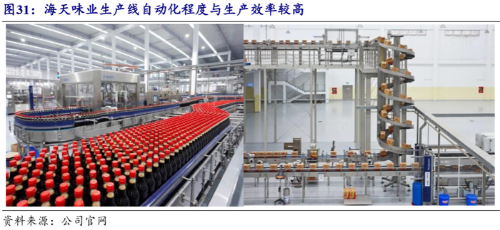 技术升级、工艺领先,效率提升压缩制造成本。在技术方面,海天味业具备自主研发的知识产权和对标国际的先进工艺设备,生产效率高。如海天味业的圆盘制曲技术国际领先;拥有时速达4.8万瓶的全自动智能包装生产线10余条(国内最快酱油包装线),每条生产线只需要5人操作,节约人力成本;拥有高度集约化与自动化、高品质保障的立体仓库4个,总仓储能力超500万吨,从下达指令到出仓完成只需120秒,大幅提升仓储效率等。领先的技术工艺与自动化程度高的生产线,大幅降低生产制造成本。2019年公司又加快产线的升级改造,进一步提高生产效率。