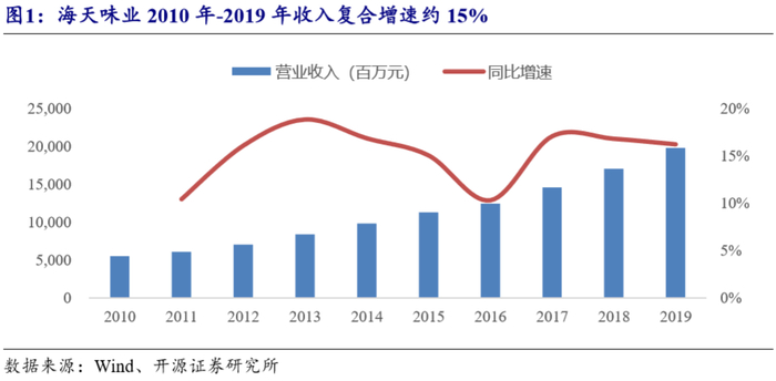 历史悠久,稳定成长。海天味业最早溯源于“佛山古酱园”,至今已有300余年历史。1955年佛山25家古酱园合并组建海天酱油厂,1995年完成转制改革,变更为有限责任公司,自此进入快速发展道路。企业营收规模由2010年55亿元提升至2019年198亿元,年复合增速约15%。