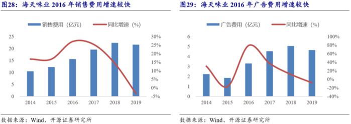 行业由渠道竞争变为品牌竞争。随着全国化渠道网络逐渐搭建、多品类产品结构完善,调味品企业间的竞争将不再仅以渠道数量为单位。龙头海天已率先从渠道驱动进入品牌驱动,促销费用稳步提升,2015年至2018年,公司收入由112.94亿元增至170.34亿元,同期广告费用由1.85亿元增至5.06亿元,广告费增幅远超收入增幅。海天味业正拉动行业提前从产品和渠道竞争转变到品牌竞争。