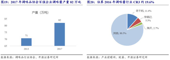 酱料可分为酿造酱、配置酱与其他酱类三种。由于调味酱细分品类多,行业格局分散,统计数据口径差异较大。常用数据一是调味品协会公布的百强企业数据(2017年调味酱产量82万吨,收入规模68亿),但百强企业中未包含酱料龙头老干妈、李锦记,统计范围较小,数据部分程度失真。二是产业前瞻网公布数据,2016年中国调味酱市场规模约400亿。我们认为后者更可能贴近产业真实情况。