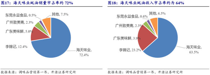 蚝油是用蚝汁熬制而成的调味料,首先由李锦记创始人发明,初期属于高档调味料,多用于高端餐饮店。后期海天味业改进工艺、降低成本,使之成为大众调味品,并推广至全国,成为子行业龙头。蚝油市场基本被海天与李锦记瓜分,两家2012年分别占产量的72%与12%,占收入的64%与23%,产量与收入CR2分别为84%与87%,行业处于寡头格局,李锦记主要占据中高端市场。但蚝油仍处于向全国扩张进程中,市场的渗透率仍低,全国仍存有空白地区,给其他企业进入留下了空间。