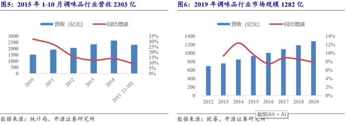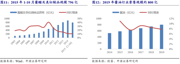 调味品行业数据口径众多,差别较大。我们通过不同数据的交叉验证,尽量还原行业真实情况。根据统计局公布数据,2015年1-10月调味品行业规模约2300亿,该口径为调味品企业出厂口径。根据欧睿数据,2014年至2019年,调味品市场规模由852亿增至1282亿,年复合增速为8.2%,该口径包括酱醋、酱料、蚝油等,品类少于统计局口径。我们根据欧睿数据的年复合增速,推测计算统计局口径调味品行业规模在2019年应该达到3900亿元。考虑到统计局口径会有重复计算情况,我们剔除重复计算(参考统计局2018年对酱油行业数据进行调整,绝对值数据缩减为2017年的63%),估算调味品行业规模应在2500亿元左右。按此数据计算龙头海天市占率约为8%,也与市场普遍认同的海天味业在调味品市占率7%的数据较为一致。