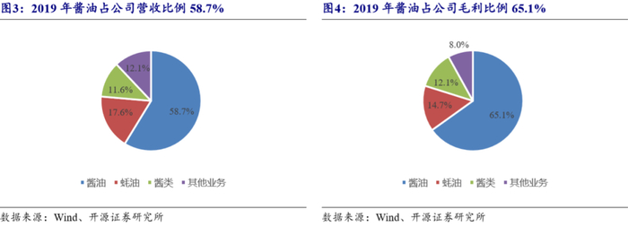 酱油贡献主要收入,蚝油与酱料是重要补充。2019年公司主营业务中,酱油品类占总收入比例约58.7%,占毛利比例约65.1%,是最主要的收入与利润来源。蚝油与酱料是重要的补充品类,2019年分别占总收入的17.6%、11.6%,占毛利的14.7%、12.1%。