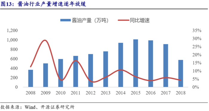 酱油是最大的调味品细分子行业。国内酱油渗透率已高,销量增速已经放缓。根据欧睿数据,2019年酱醋零售规模约800亿元,估算酱油行业真实产值规模约400亿左右,是调味品中最大细分领域。统计局公布2017年酱油行业产量910万吨;2018年酱油行业产量575万吨,同比增4.3%。该口径差异原因是2018年统计局对规模以上企业口径有所调整,剔除重复计算情况,增速更具有代表意义。观测酱油行业产量增速,呈逐年放缓趋势。