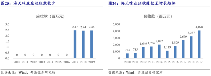 下游议价能力高,严格先款后货,强化经销商管理。公司对于经销商执行严格的先款后货制度:应收账款几乎为0(收购镇江丹和醋业,导致2017年开始产生少部分应收账款);预收款随着公司营收扩大,一直保持增长势头。此外公司一级经销商有着排它性,只经销海天味业主要产品,也侧面反映出公司对渠道有着较强话语权。