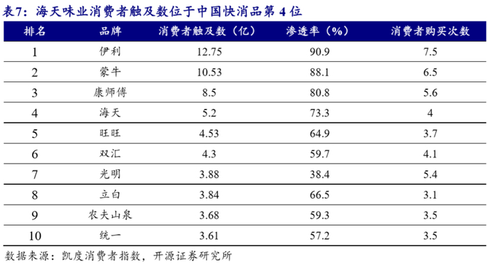 海天味业多年坚持品牌战略,已初见成效。根据新华网睿思2019年发布的《食品品牌竞争力评价体系》报告,海天味业品牌综合指数为81.5,位列第二;品牌延伸能力得分90.07,位列第一。品牌延伸能力强说明海天品牌协同效应较好,能够通过知名度高的产品带动新产品的发展,在推广新产品上更有优势。除此之外,在凯度消费者指数2019年发布的全球品牌足迹报告中国榜单中,海天味业凭借5.2亿的消费者触及数位列中国快消品品牌第四位,且是排名前十企业中唯一的调味品企业。
