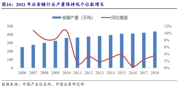 食醋产业增长平稳,产业集中度有待提高。食醋行业数据口径较多,我们首先估算行业真实市场规模。据中国调味品协会显示,参与2018年调味品企业百强统计的食醋企业有39家,食醋生产总量165万吨,同比增6.3%;销售收入63.11亿元,同比增8.1%;吨价3845元。根据中国产业信息网数据,2018年国内食醋产量约437万吨,假设食醋行业吨价约3000元,我们估算2018年食醋行业真实产值约为130亿元。