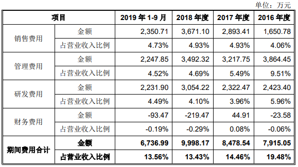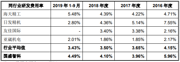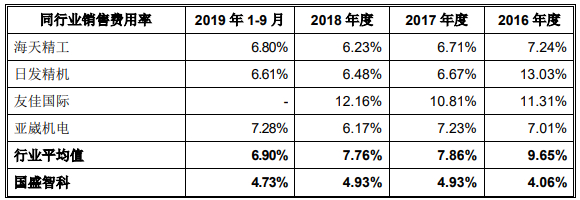 国盛智科2018年研发费用率相较2016年出现下滑,但销售费用率在上升。2016年-2018年及2019年1-9月,国盛智科研发费用分别为2423.40万元、2322.47万元、3054.22万元和2231.90万元,研发费用占营业收入的比例分别为5.96%、3.96%、4.10%和4.49%。各期,国盛智科研发费用率高于同行,同行业研发费用率平均值分别为4.15%、3.65%、3.50%、3.43%。
