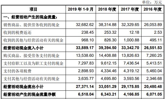国盛智科各期销售商品、提供劳务收到的现金远低于营收。国盛智科4月20日披露的科创板招股书(上会稿)显示,2016年-2018年及2019年1-9月,国盛智科营业收入为4.06亿元、5.86亿元、7.44亿元、4.97亿元。销售商品、提供劳务收到的现金分别为2.61亿元、3.23亿元、3.83亿元、3.27亿元。归属于母公司所有者的净利润分别为5764.84万元、9308.49万元、9553.52万元、6089.73万元。经营活动产生的现金流量净额分别为6071.05万元、4166.85万元、6343.21万元、6518.04万元。