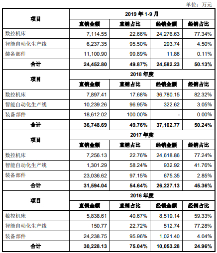 经销模式已成为国盛智科的主要销售模式。国盛智科招股书表示,发行人数控机床以经销模式为主,大部分智能自动化生产线为直销,大部分定制化机床本体和全部精密钣焊件、铸件对外销售均为直销。2016年-2018年及2019年1-6月,国盛智科经销收入分别为1.01亿元、2.62亿元、3.71亿元、2.46亿元,经销收入占主营业务收入的比例分别为24.96%、45.36%、50.24%、50.13%。其中国盛智科主打产品数控机床经销收入占比高达80%左右。