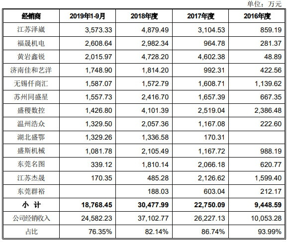 据国盛智科对上交所首轮问询函的回复,报告期国盛智科排名前五大经销商合计涉及13家经销商。2016年-2018年及2019年1-6月,国盛智科对这13家重要经销商的销售收入分别为0.94亿元、2.28亿元、3.05亿万元、1.88亿元,占国盛智科经销收入的比例分别达93.99%、86.74%、82.14%、76.35%。
