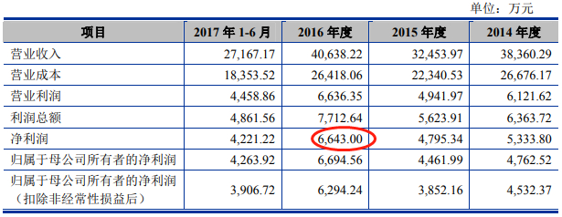 2017年9月27日报送的招股书显示,国盛智科2016年净利润为6643.00万元,较前版少97.37万元。