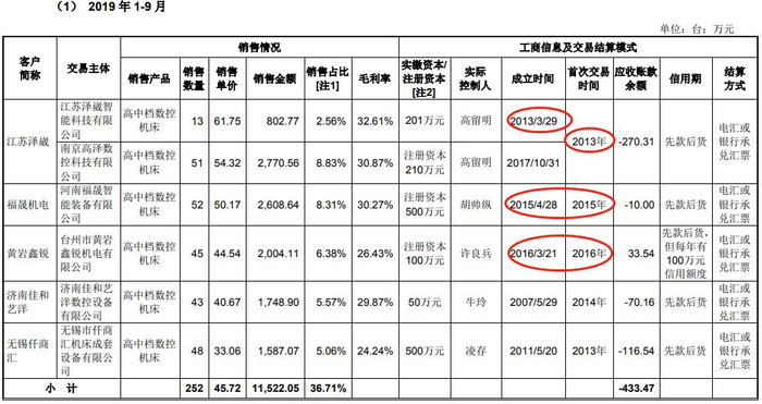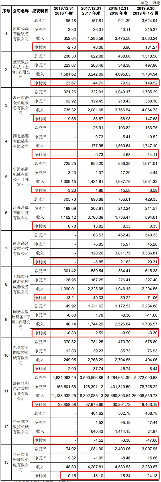 2019年1-9月,上述13家经销商中,8家微利,其中盈利最多的为河南福晟智能装备有限公司盈利181.27万元;5家亏损,亏损最多的为济南佳和艺洋数控设备有限公司亏损1.95亿元。