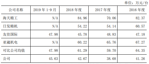2016年-2018年及2019年1-6月,国盛智科数控机床平均单价分别为41.26万元、38.68万元、42.67万元和45.56万元,同行业平均单价分别为64.35万元、59.70万元、61.29万元和47.98万元。
