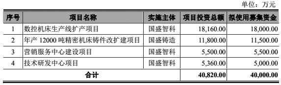首次IPO冲关,国盛智科拟募集资金为4亿元,募投项目为4个:“数控机床生产线扩产项目”、“年产12000吨精密机床铸件改扩建项目”、“营销服务中心建设项目”、“技术研发中心项目”。