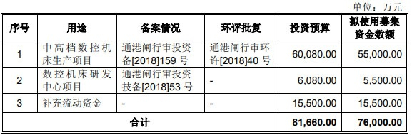 第三次IPO冲关,国盛智科拟募集资金为7.6亿元,募投项目为3个:“中高档数控机床生产项目”、“数控机床研发中心项目”、“补充流动资金”。