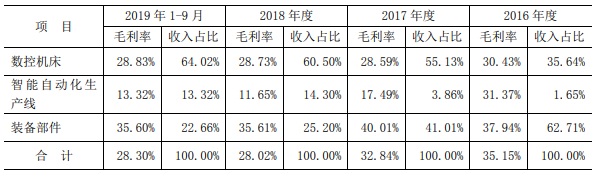 国盛智科表示,报告期内,公司主营业务毛利率下降的主要原因是收入结构发生较为明显变化所致报告期内,2017年毛利率下降主要系数控机床业务、智能自动化生产线毛利率下降及毛利率较高的装备部件业务收入占比下降所致;2018年毛利率下降主要系配套赫斯基的智能自动化生产线-PET瓶胚自动化生产线智能单元毛利率较低且收入占比大幅上升以及毛利率相对较高的机床本体业务大幅压缩所致。2019年以来,毛利率基本维持稳中有升的态势。