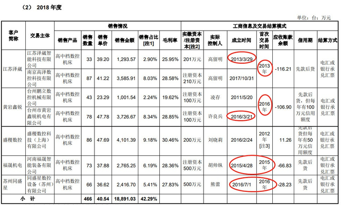 此外,国盛智科13家重要经销商中4家为成立当年即与国盛智科交易。江苏泽崴智能科技有限公司2013年3月29日成立,2013年即与国盛智科首次交易。河南福晟智能装备有限公司2015年4月28日成立,2015年即与国盛智科首次交易。台州市黄岩鑫锐机电有限公司2016年3月21日成立,2016年即与国盛智科首次交易。同盛星数控设备(苏州)有限公司2016年7月1日成立,2016年即与国盛智科首次交易。这4家成立当年即与国盛智科交易的经销商均位列国盛智科2018年数控机床前5大经销商。
