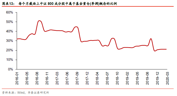 图表13展示了每个月截面上中证800成分股中属于基金重仓(季调)概念的比例。