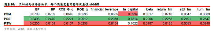 图表16展示了各倾向性评分方法中,每个混淆变量的标准化差值stddiff。总体来看,倾向性评分加权法(PSW)中各混淆变量的标准化差值最小(除了ln_capital),说明PSW中混淆变量在处理组和对照组间较均衡,其因果效应估计值可能更可靠。