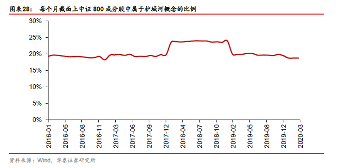 图表28展示了每个月截面上中证800成分股中属于护城河概念的比例。
