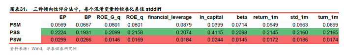 图表31展示了各倾向性评分方法中,每个混淆变量的标准化差值stddiff。总体来看,倾向性评分加权法(PSW)中各混淆变量的标准化差值最小,说明PSW中混淆变量在处理组和对照组间较均衡,其因果效应估计值可能更可靠。