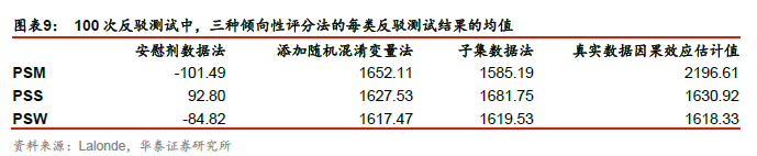 图表17展示了100次反驳测试中,三种倾向性评分法的每类反驳测试结果的均值。我们将三种倾向性评分法在真实数据下的因果效应估计值放在图表17最右侧进行对比。在安慰剂数据法中,由于生成的安慰剂数据(Placebo)替代了真实的处理变量,每个样本是否属于概念的事实已不存在,因此反驳测试中的因果估计效应大幅下降,接近0,这反过来说明了处理变量对结果变量具有一定因果效应。在添加随机混淆变量法和子集数据法中,PSW的反驳测试结果与真实数据因果效应估计值最接近,说明其因果效应估计值可能更可靠。